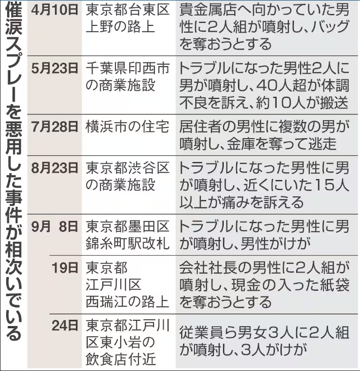 昨今、催涙スプレーの悪用事例が相次いでいますが、実際にどのような事例があるのでしょうか。